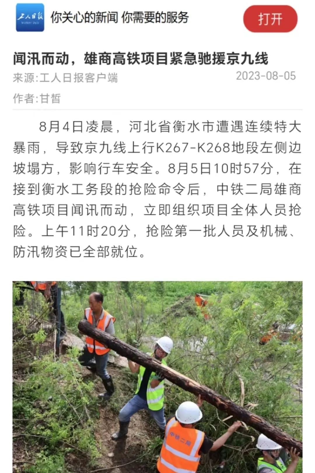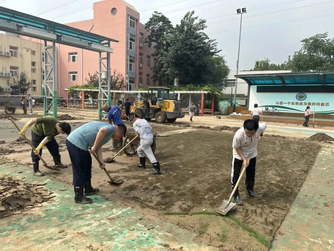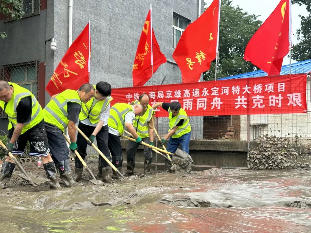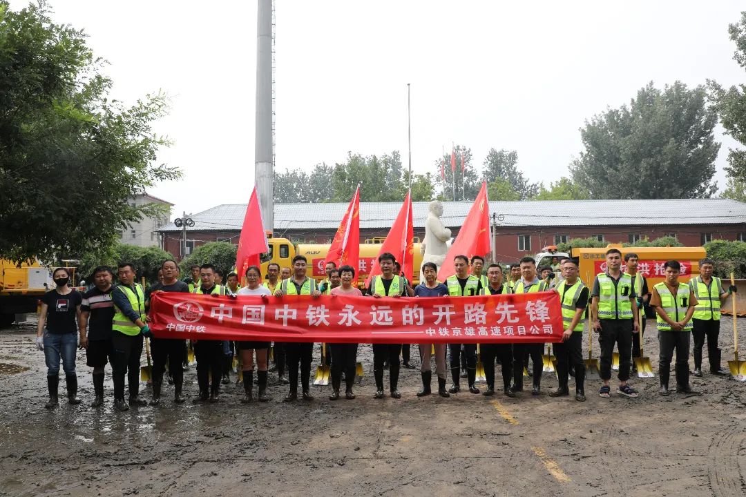 中铁上海局建筑公司京雄高速永定河特大桥项目部接到中铁京雄高速公司通知,房山区石楼镇中心校夏村小学受水淹垮塌的泥石流灾害,学校围墙被冲毁,校内园区、操场、全部教室近3万平方米被淤泥覆盖。面对灾害险情,项目部闻令而行,火速组织抢险小队50余人,携带清扫工具、铲车4台、洒水车3台、运输车10余台前往灾害地点开展救援工作。抢险小队采用人工、机械相结合的方式,依次经过铲、推、冲、洗四个环节,确保高效、优质完成学校清淤任务。经过抢险救援人员连续两日的不懈奋战,终于在8月4日中午完成了灾后清淤重建工作,保障了学生们快速复课。