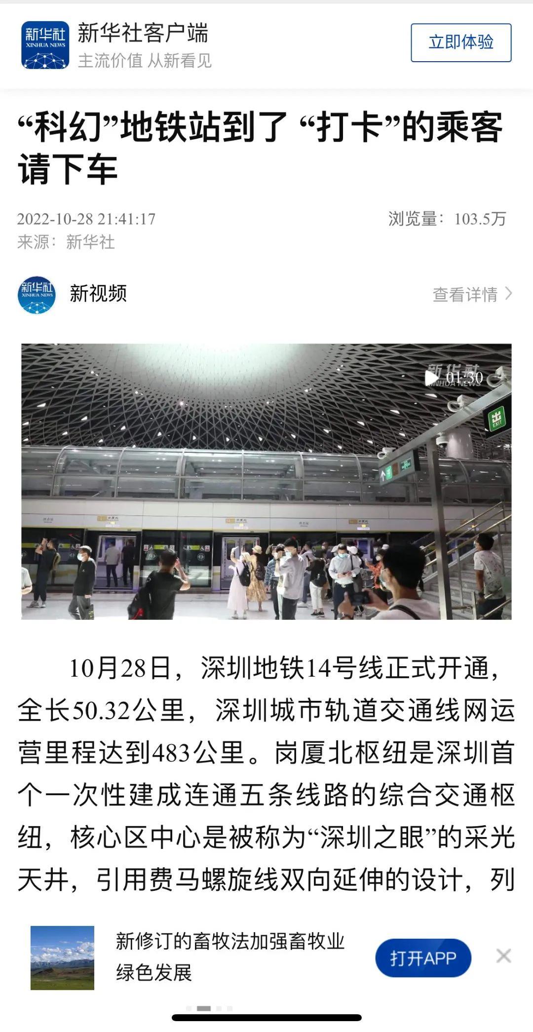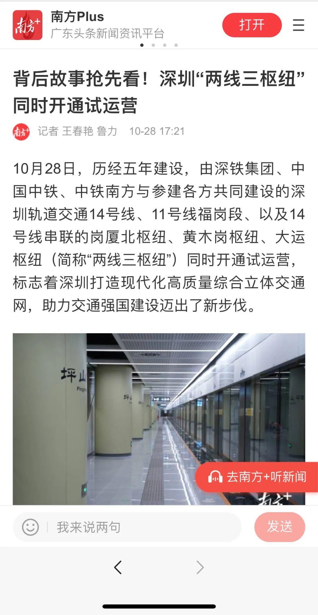10月28日,由深铁集团、中国中铁、中铁南方与参建各方共同建设的深圳轨道交通14号线、11号线福岗段、以及14号线串联的岗厦北枢纽、黄木岗枢纽、大运枢纽(简称“两线三枢纽”)开通运营,其前瞻的设计、匠心的施工、平稳快速的无人驾驶体验、便民出行的各类高科技运用、一站一景的特色,引得 广大市民及各类社会媒体纷纷前往拍照打卡、点赞刷屏,并受到了中央和地方等主流媒体广泛好评和报道。下面,我们一起来看看有哪些主要媒体吧!