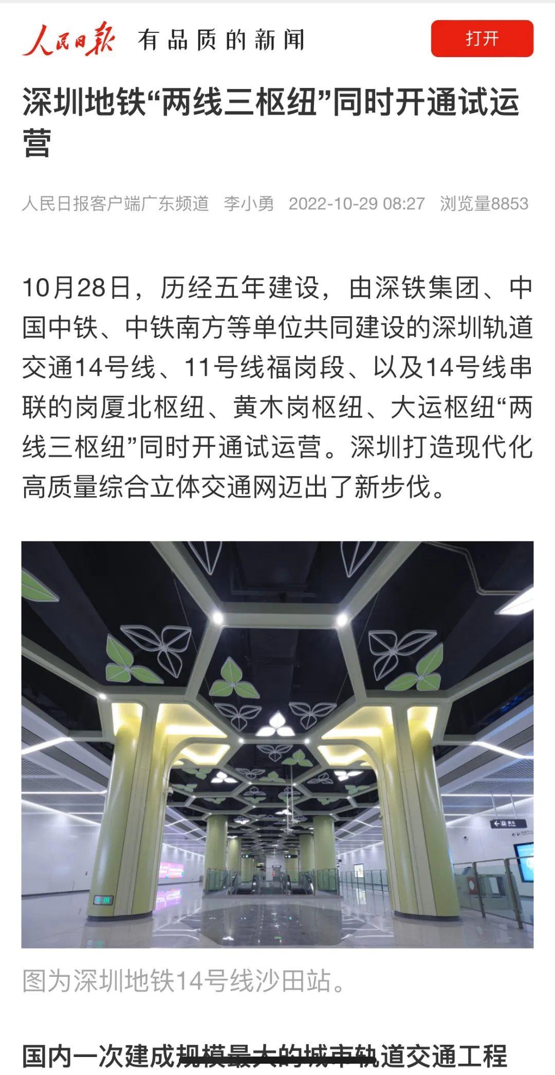 人民日报丨深圳地铁“两线三枢纽”同时开通试运营