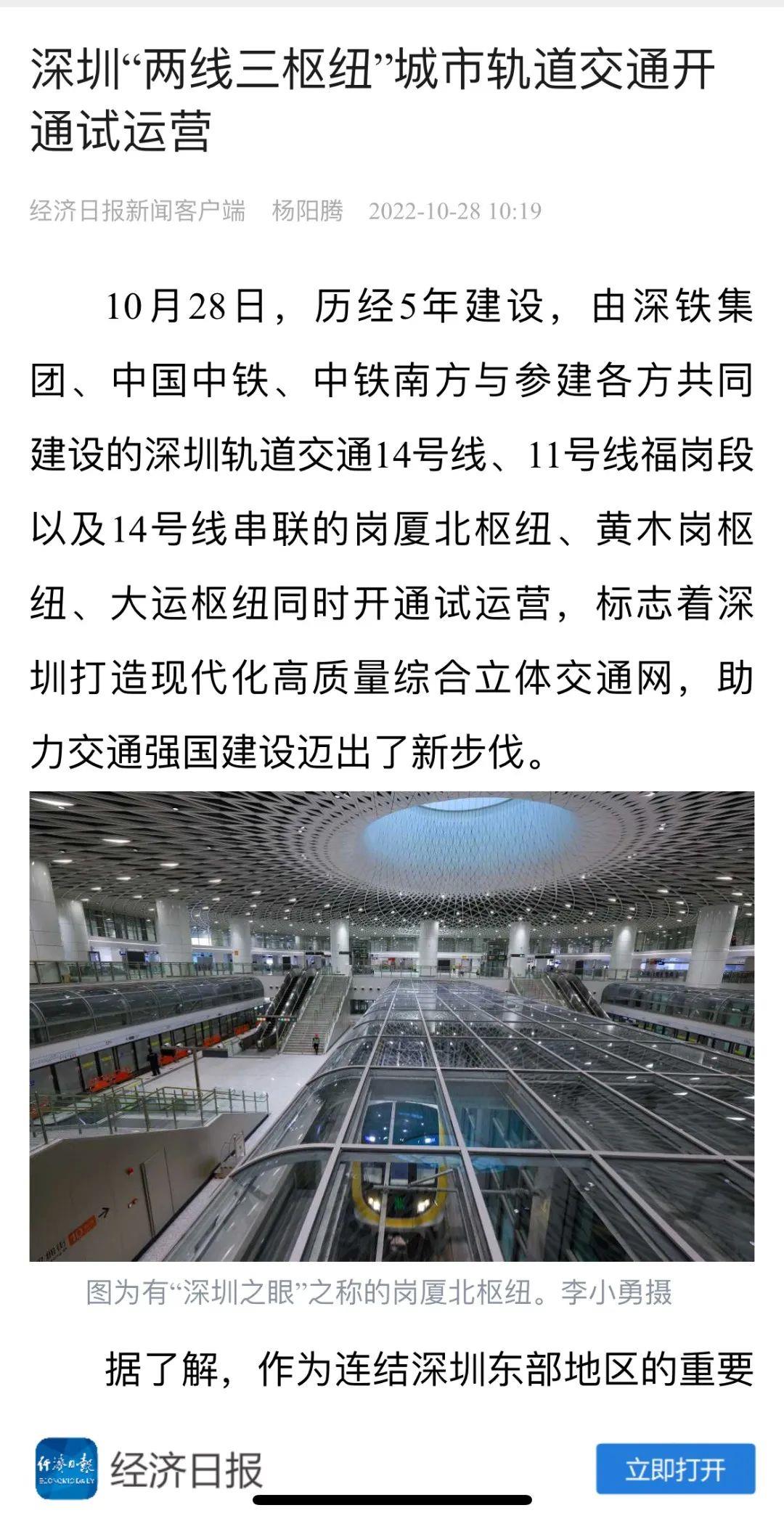 经济日报丨深圳“两线三枢纽”城市轨道交通开通试运营