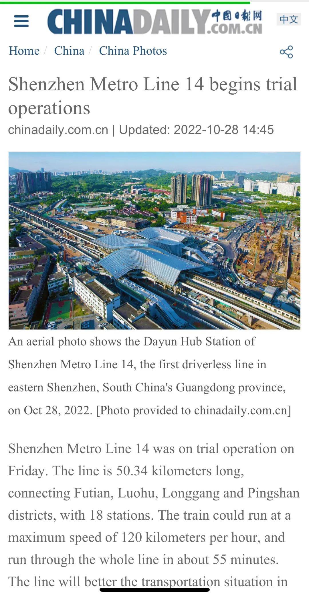 中国日报网丨Shenzhen Metro Line 14 begins trial operations