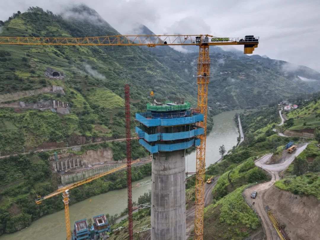 江底牛栏江特大桥是全线控制性工程之一,位于贵州省威宁县和云南省会泽县交界的牛栏江上,总长度568.8米,主墩高122.5米,设计桩基102根/3071m、全桥设计7个墩身、2个桥台。此次封顶为2#墩,设计为圆端形空心墩,墩高54m,设计C35混凝土1202.7m³。