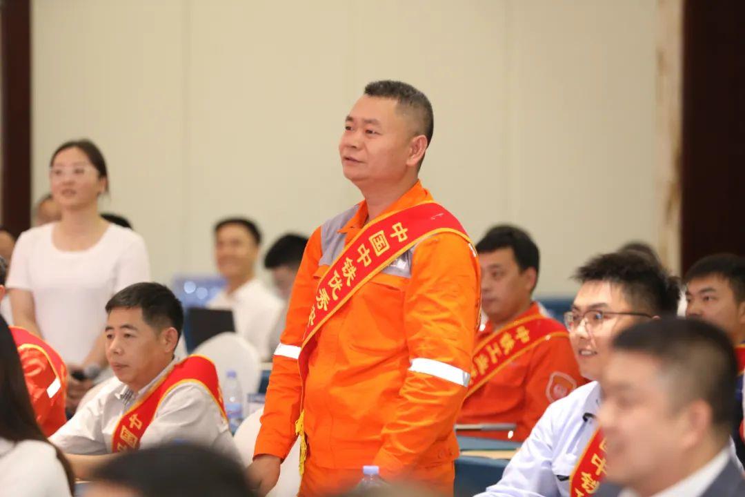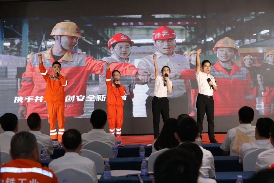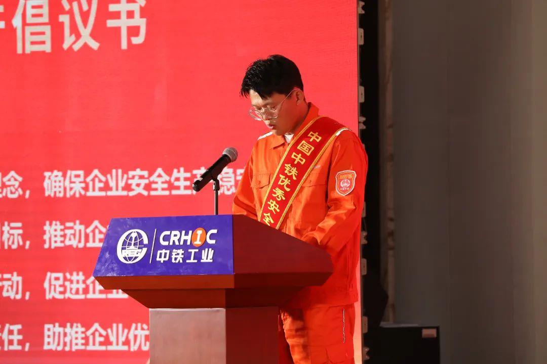 ▲ 中国中铁“2022年度优秀安全卫士”中铁山桥桥梁分公司群安员孙楠代表一线职工宣读安全生产倡议书