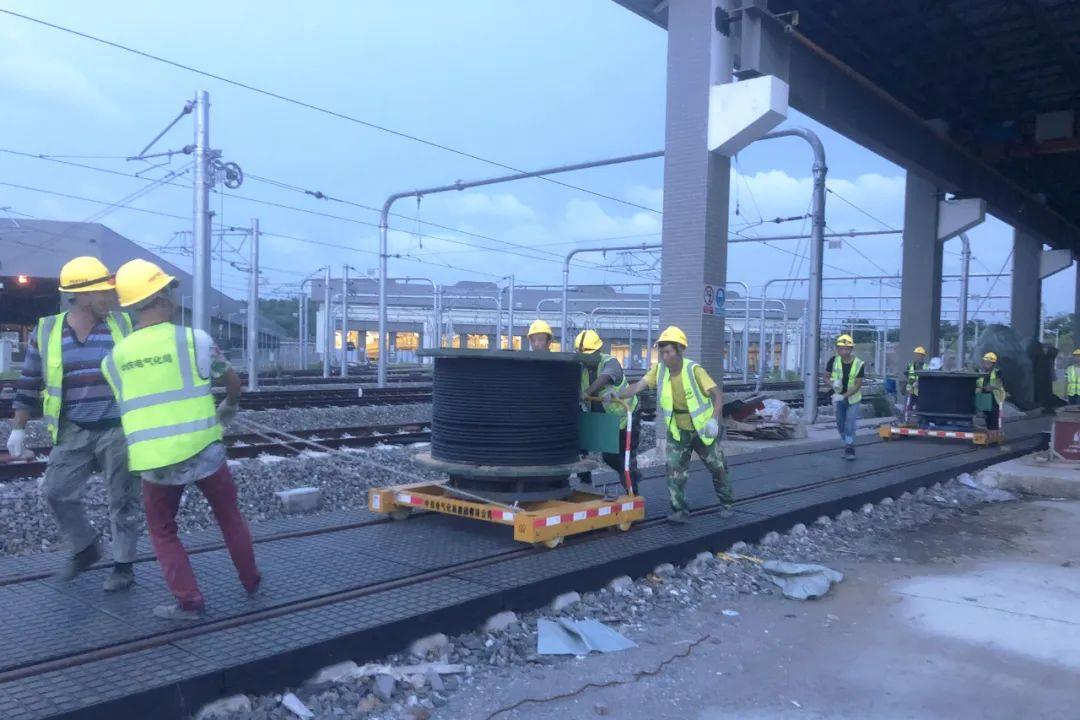作业期间,领导干部现场全程跟班盯控,严控施工安全及作业质量,全力确保软横跨更换整治工作安全有序推进。全体作业人员白昼交替,战高温斗暴雨,克服了作业难度大、夜间施工紧、施工协调广等一系列困难,施工人员可在夜间短暂的60分钟“天窗”内,优质高效地完成3组软横跨更换。