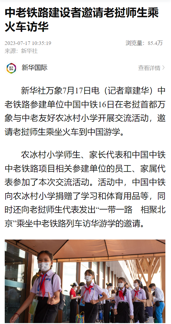 在万象期间,职工及家属共同前往由中国援建的友谊工程——老挝农冰村小学参观交流。农冰村小学学生用精彩的老挝民族舞蹈对他们表示热烈欢迎。中老两国小朋友在轻松愉快的氛围中表演了歌唱、舞蹈、武术、朗诵等互动节目,并互赠纪念品进行“友谊结对”。